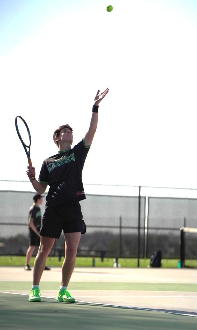 Senior Lucas Neckel tosses the ball and prepares to serve during a 2023 match.Photo by Jack Ward
