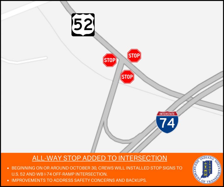 WEST HARRISON – The Indiana Department of Transportation will install a new all-way stop for the westbound Interstate 74 off-ramp to U.S. 52.