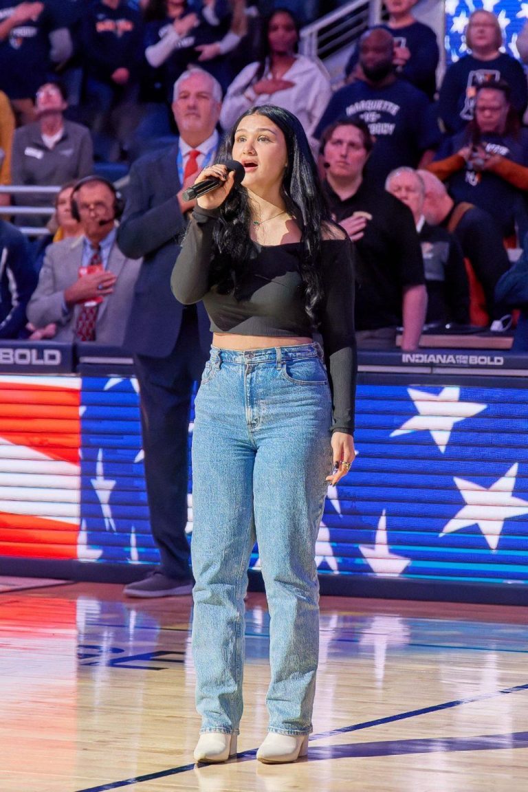 East Central High School junior Chloe Stewart sang the National Anthem before the girls high school Class 1A basketball final at Gainbridge Fieldhouse in Indianapolis Saturday, Feb. 24.Photo by Sandy Mahoney