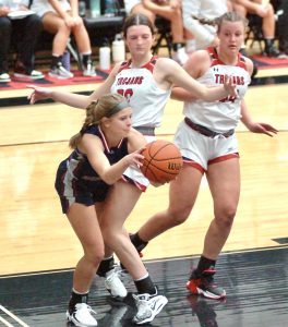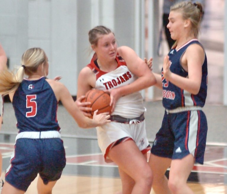 East Central freshman Teagan Leihgeber wrestles for a rebound in the season-opening win over South Dearborn No. 1.