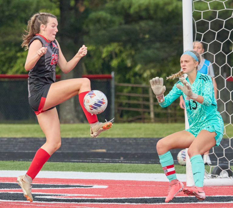 East Central’s Riley Renck confronts South Dearborn goalkeeper Taytum Barker before passing off to a teammate in the Trojans’ 8-0 EIAC girls varsity soccer win at Trojan Field Aug. 29.(Sandy Mahoney)