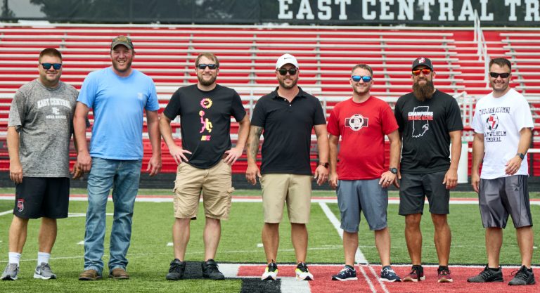 East Central High School honored alumni from its 2004 men’s soccer state finalist team during the current Trojans’ season-opening 6-1 home victory over Oldenburg Academy Saturday, Aug. 17. Joining head coach BJ Black (left) during the festivities were, from left: Adam Weber, Alex Wilhelm, Chris Kammer, Kevin Davis, Keith Davis and TJ Rauch.(Sandy Mahoney)