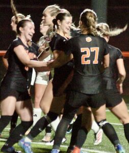 With the Franklin goalkeeper drawn out, East Central’s Nevaeh Tudor (19) scores the go-ahead goal into the open net in the second half of EC’s 2-1 Class 3A girls soccer regional semifinal road win Thursday, Oct. 18.Sandy Mahoney